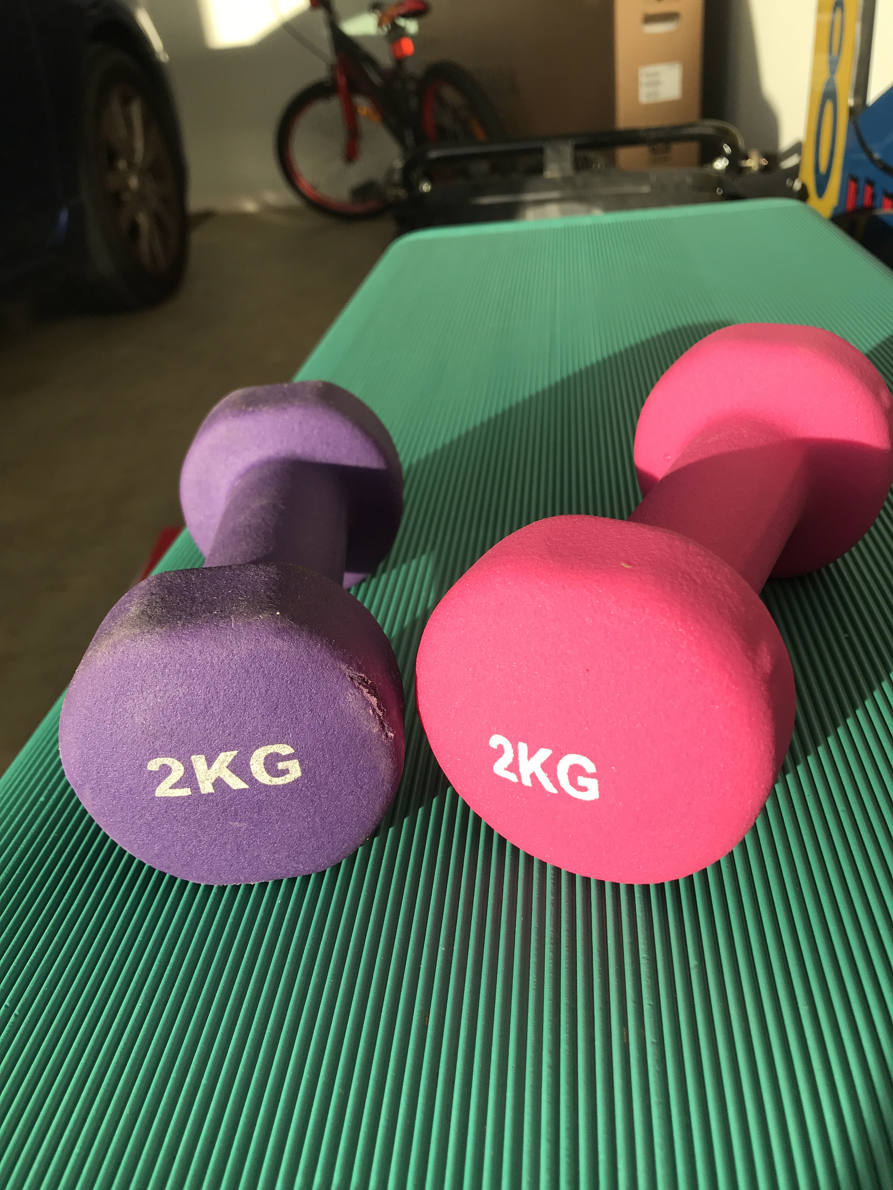 Paired up the purple (that I got for free from someone) with a pink that I brought home this afternoon for $9. Finally, after waiting for many months. They weren’t somehow stocking just the 2 KG ones.